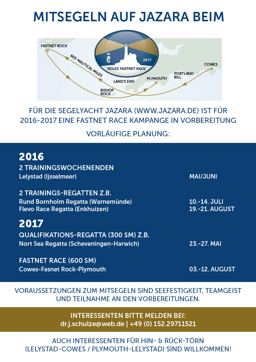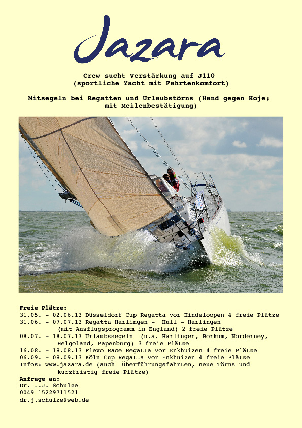 Auf unsem Club-Abend am 14.01.2015 berichtet Hajo Schulze über die Hochsee Segel-Törns und -Regatten mit seiner Yacht Jazzara und stellt das Regatta- und Törn-Programm des Jahres 2015 vor. Unter anderem soll es nach St. Malo und zu den Kanalinseln gehen. Mitsegler, auch Nichtmitglieder eines Segelvereins, sind auf der Basis Hand gegen Koje willkommen. Auch Kooperationen z.B. für zukünftige Flotillenfahrten sollen zur Sprache kommen. Für weitere Informationen bitten wir Dr. Hajo Schulze anzusprechen.