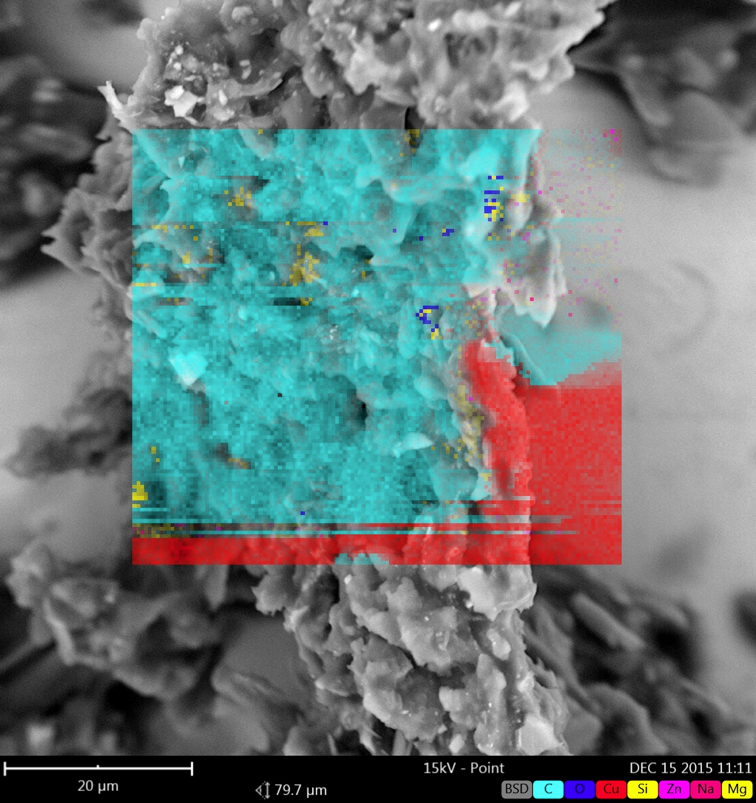 Ein EDX-Flächenscan zeigt, dass es sich hierbei um Kohlenstoff handelt. Es könnte sich hier um kristallisierte Öle handeln.