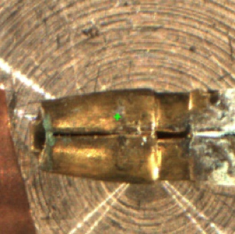 Hier ist der Rundkontakt zu sehen, aufgenommen von der Digitalkamera im REM. Grün markiert ist der Punktm, auf den man den Elektronenstrahl später richten will (Zoomziel)