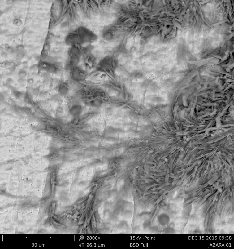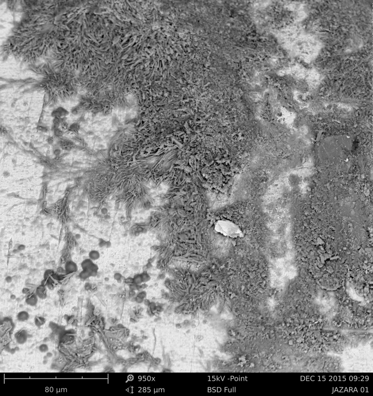 Auf Wunsch von Hajo möchte ich Euch gerne einige Bilder und Analysen zeigen, die in diesem Zusammenhang gemacht worden sind. Ja, das neue Rasterelektronenmikroskop und die angehängte EDX-Einheit sind ein tolles Spielzeug ;-) Aber der Reihe nach.